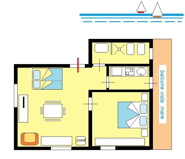VISTA MARE.  Un matrimoniale in camera ed altri 2 posti nel divano con due letti estraibili nel soggiorno